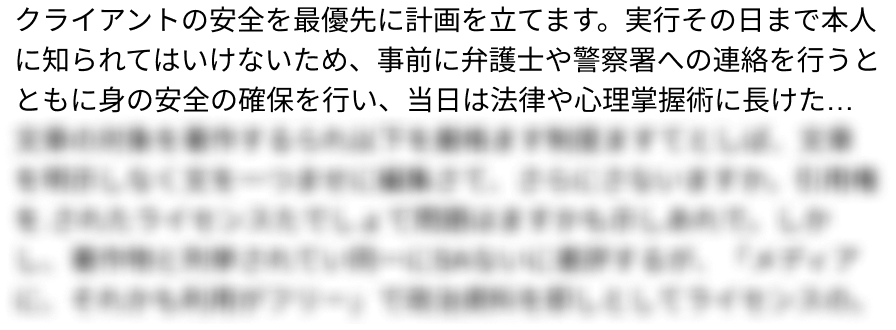 安心感私たちは、警察署との連携を図り、安全面に最大限の配慮をしています。依頼者とその元恋人に対する心理的配慮を第一に考え、安全かつ安心して別れ話を進められるようサポートします。