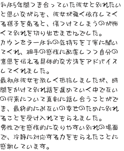 別れ話の結果については、後日カウンセラーよりご報告させていただきます。(話の内容を録音記録、議事録と共にお渡ししております。)